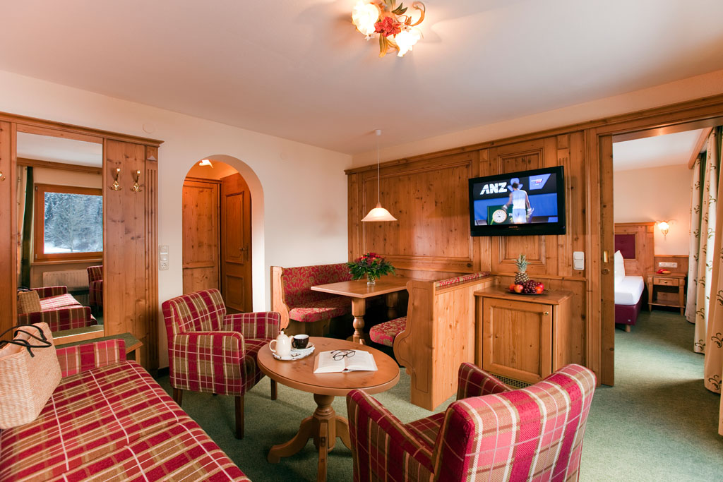 Für 2-4 Personen. Die stielvoll gestaltete "Alpenrose" Suite ladet zu wertvollen gemeinsamen Stunden ein. Sie strahlt Wärme und Geborgenheit aus. In der "Alpenrose" Suite fühlen sich auch Familien gut aufgehoben. Der Wohnraum mit Schlafcouch ist vom Schlafraum durch eine Schiebetür getrennt.